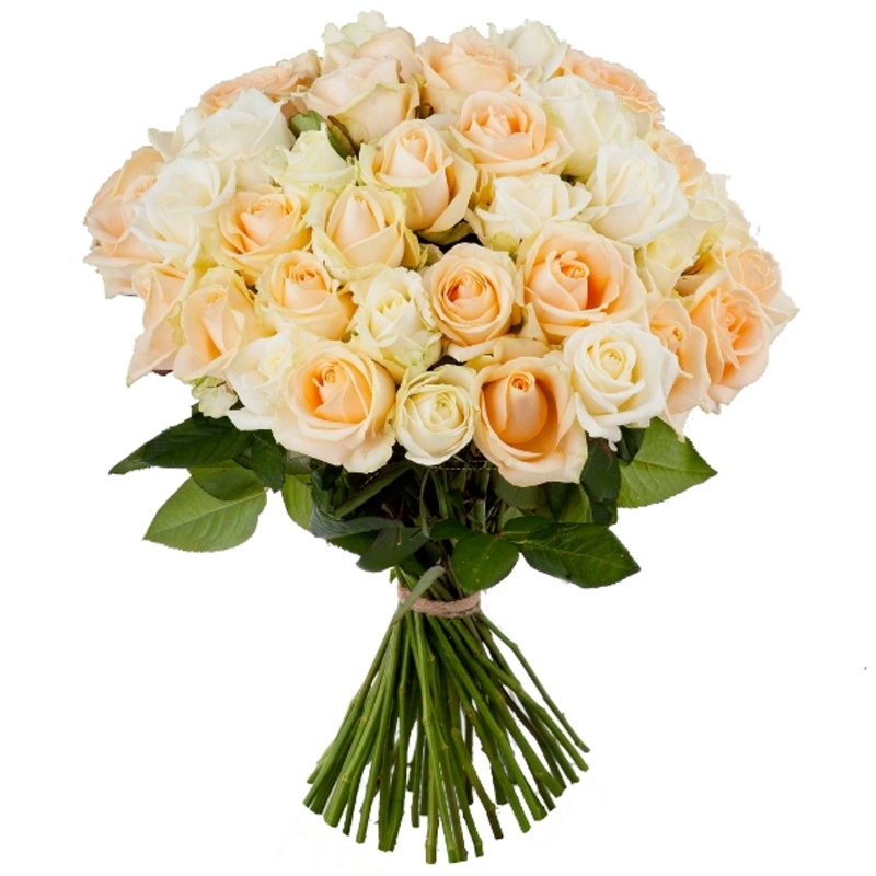 Букет состоит из 23 белые розы, 22 кремовые розы, прозрачная упаковка, атласная лента.