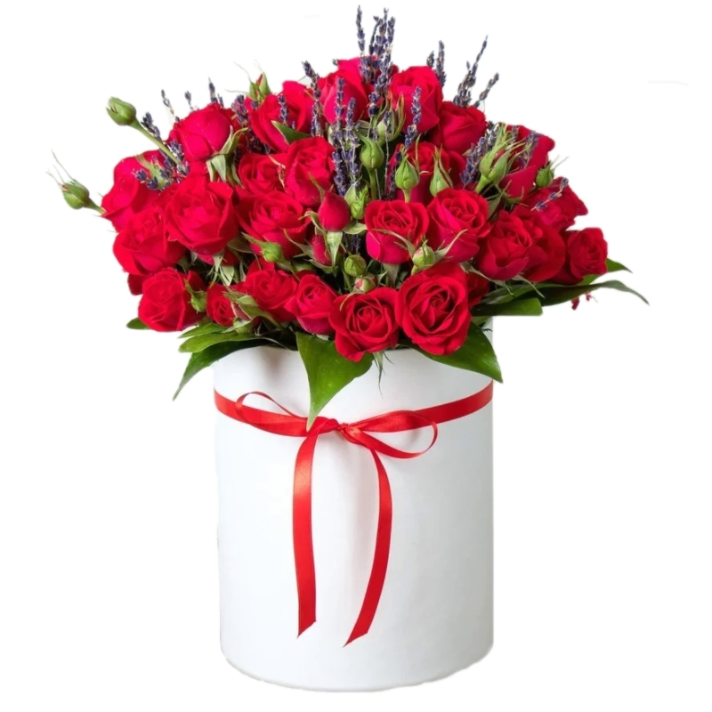 Букет состоит из 19 красных кустовых роз, лаванда, коробка, оазис, атласная лента.