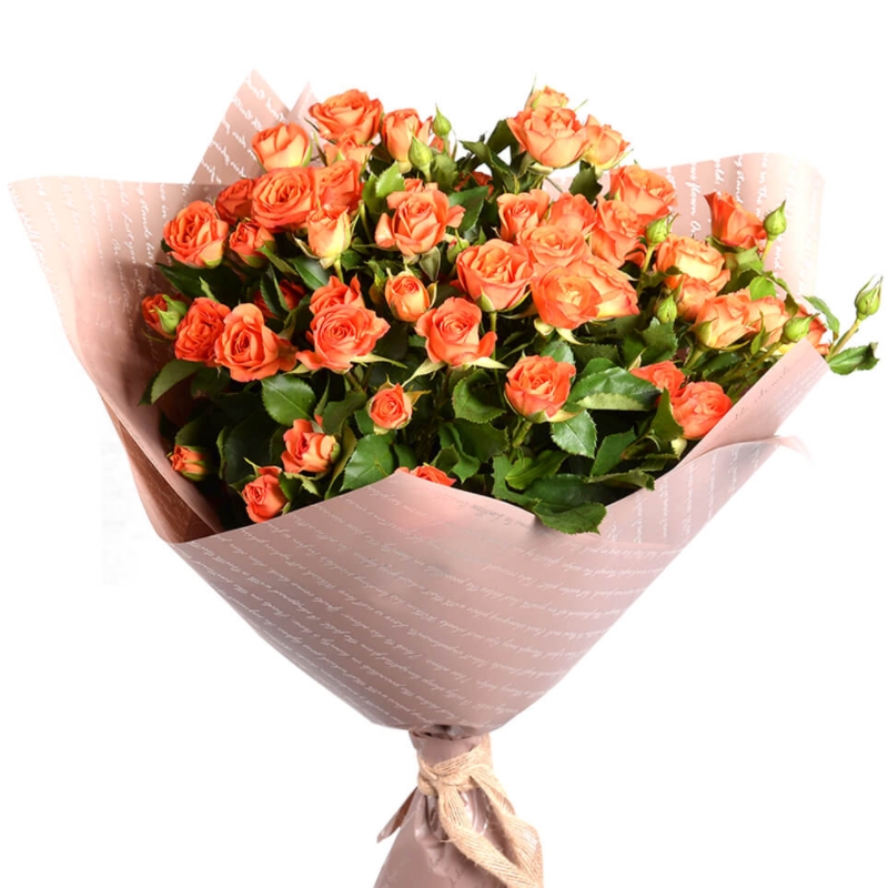 Букет состоит из 19 оранжевых кустовых роз, крафт, атласная лента.