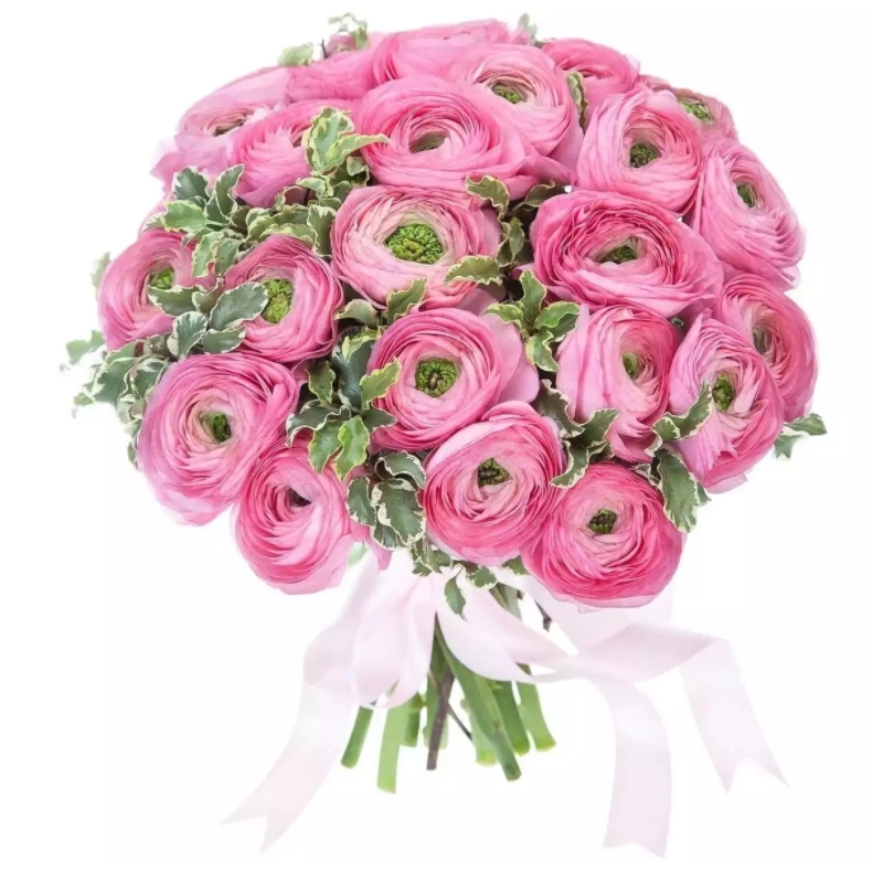 Букет состоит из 29 розовых ранункулюсов, питтоспорум, прозрачная упаковка, атласная лента.