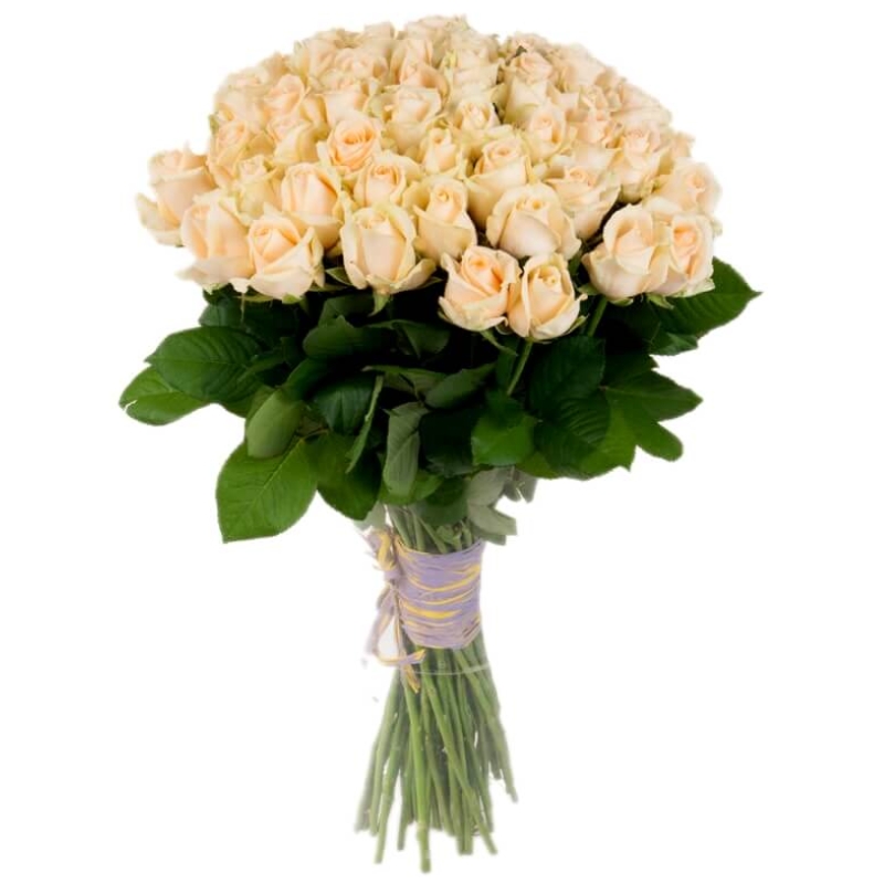 Букет состоит из 55 кремовых роз, прозрачная упаковка, атласная лента.