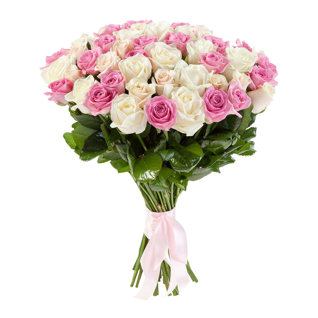 Букет состоит из 25 белых роз, 26 розовых роз, прозрачная упаковка, атласная лента.